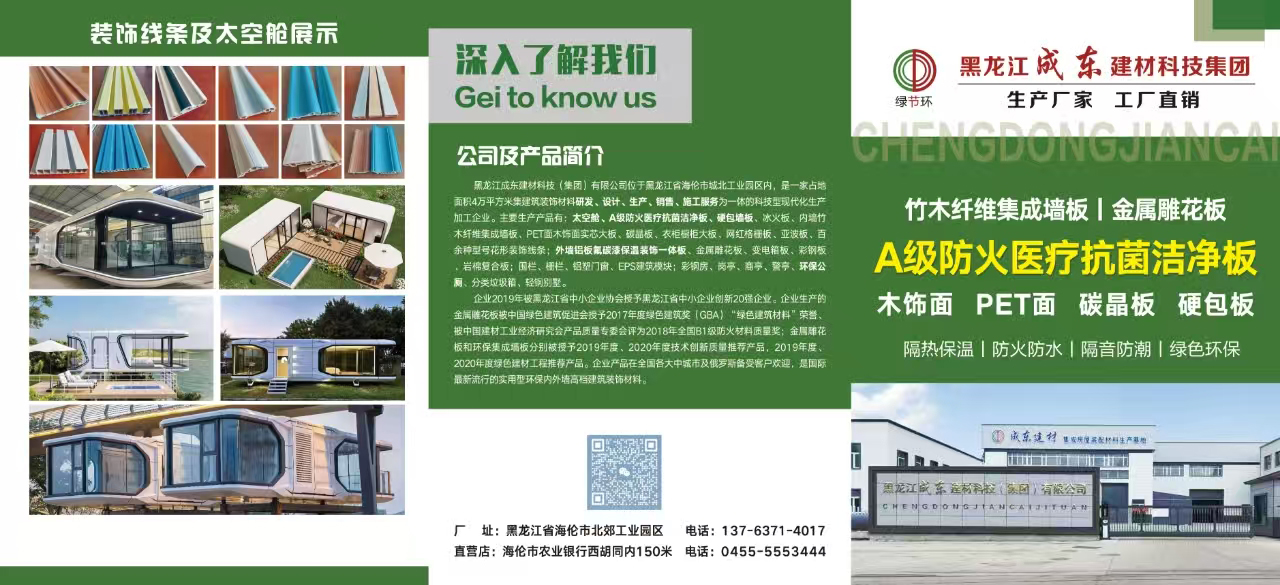 黑龙江成东建材科技(集团)有限公司位于黑龙江省海伦市城北工业园区内,西临晶波涛食品有限公司,南临海伦市裕龙塑胶制品有限公司,东临福生钢结构有限公司,北临国投生物有限公司。是一家室内外装饰材料研发、设计、生产、销售、施工服务为一体的科技型现代化生产加工企业。从2005年公司前身发展至今,注册资金3000万元,现有总资产3743万元,其中固定资产2791万元。现企业占地面积4万平方米,厂房面积2万平方米,现有职工50余人,其中技术人员15人,拥有国际先进生产设备20余台套,可年产50万平方米装饰板、1000多套太空舱。企业年营业收入达到五千万元。主要生产产品...